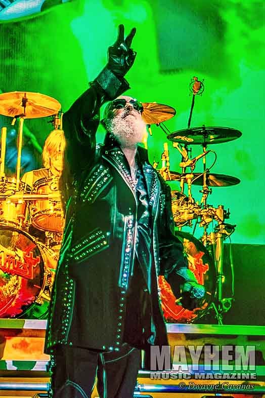 Photographs of Judas Priest at FirstBank Amphitheater in Franklin, Tn. – photos consist of vocalist Rob Halford, guitarist Richie Faulkner, guitarist Andy Sneap, bassist Ian Hill, and drummer Scott Travis.