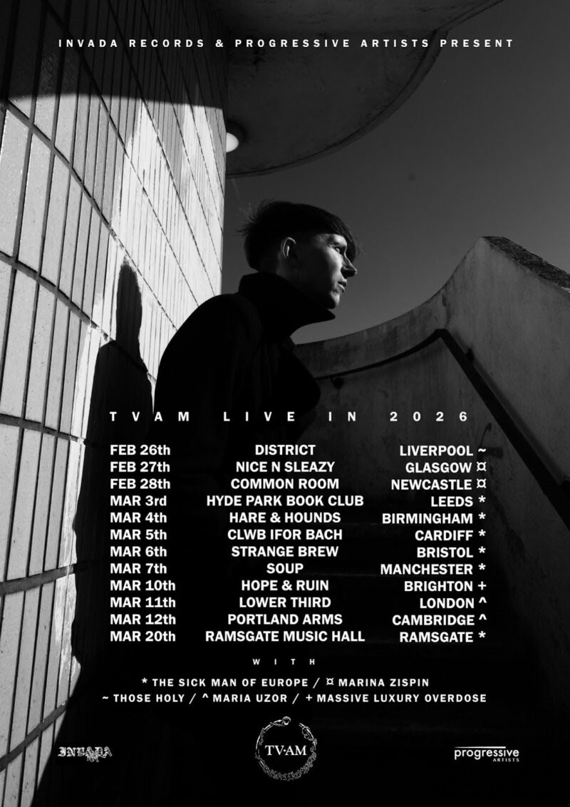 TVAM will take Ruins on the road in early 2026 with a UK tour beginning February 26 in Liverpool, followed by dates in Glasgow, Newcastle, Leeds, Birmingham, Cardiff, Bristol, and Manchester. The run continues through Brighton, London, Cambridge, and concludes in Ramsgate on March 20. Support across the tour comes from The Sick Man of Europe, Marina Zispin, Those Holy, Maria Uzor, and Massive Luxury Overdose, with each bill tailored to the city (see tour poster below).