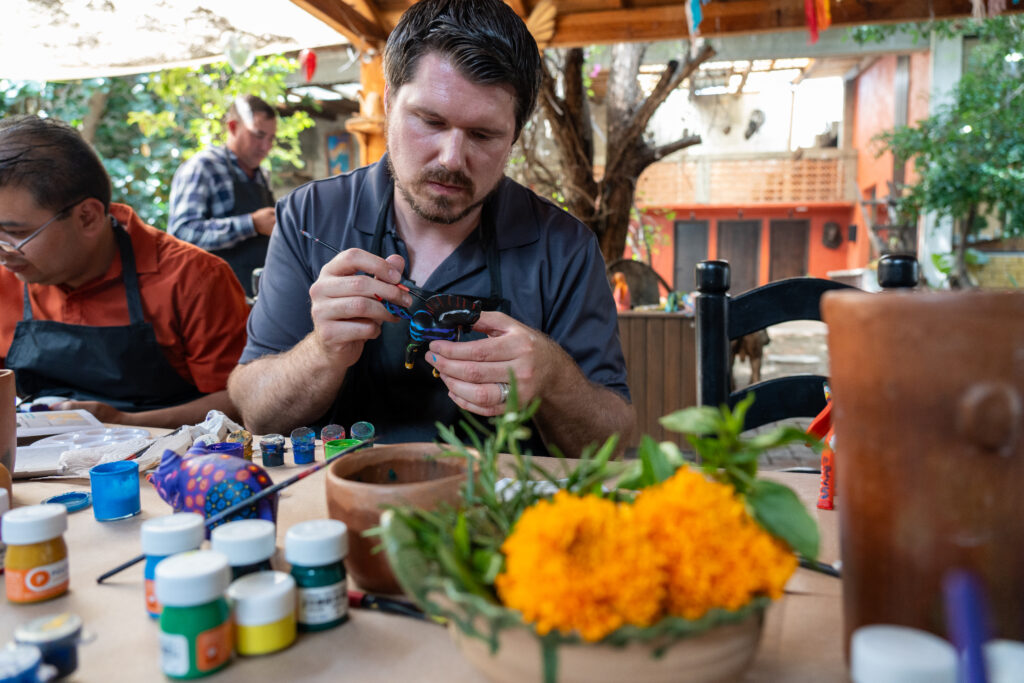 Walking around Zócalo – Mexico City’s main central squareEnjoying the Museum of Anthropology to ourselves with an after-hours visitUp close: an Aztec stone sculptureTaking in the wonders of Teotihuacan – the City of GodsSettling in for an alebrije workshop with a local artisanOur traditional folk-art creaturesBrushes out: we put our painting skills to the testThe beautiful Monte Albán – one of Mesoamerica’s earliest major citiesExploring Monte Albán’s many temples, plazas, and ruinsOur amazing local guides share insights that help us understand what we’re seeingAdmiring Frida Kahlo’s Casa Azul on a private visitFrida Kahlo’s art studio – where masterpieces startedSailing through Xochimilco’s legendary gardens by canal boatFueling up with a farm fresh mealSharing laughs and smiles over authentic cuisineLearning about typical farm life in Xochimilco from a local farmerWe arrive at the St. Regis, Mexico City in the iconic Paseo de la ReformaDiving into Oaxaca’s local flavors with a cooking demoSavoring the dishes we just madeStunning architecture surrounds Oaxaca’s streetsUnderstanding the significance of religion in OaxacaStrolling through the vibrant streets of OaxacaA privately guided visit to the Diego Riviera Museum – crowd-free