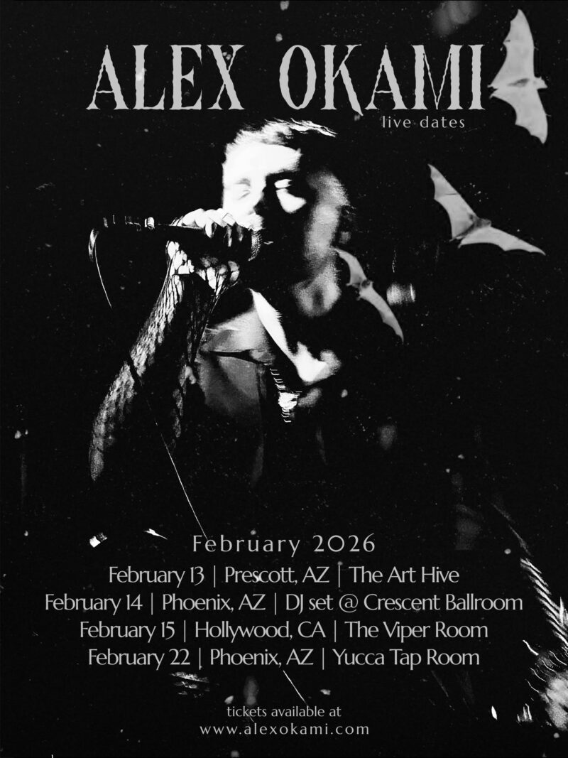 Alex Okami’s 2025 run through Phoenix, Los Angeles, Long Beach, Las Vegas, Albuquerque, and multiple Texas cities points to a project already tested under stage lights. Opening for Forever Grey, Corbeau Hangs, Haunt Me, Meldamor, Kontravoid, and Urban Heat, he carries these songs into rooms where bodies gather close, and basslines press against ribcages.