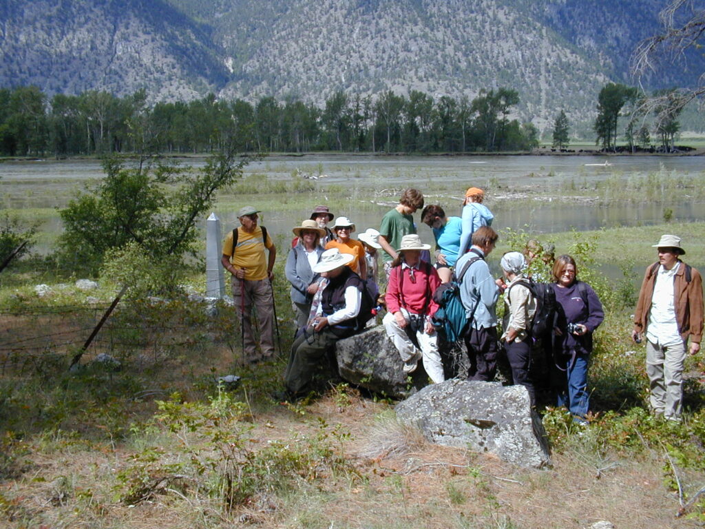 Similkameen Pines participants above the Similkameen River as it flows from Canada into Washington State, USA, during spring runoff. This tour was through a property protected for nature, first by the owners, sold to TLC, (The Nature Trust), then The Land Conservancy of Canada and now by B.C. Parks.