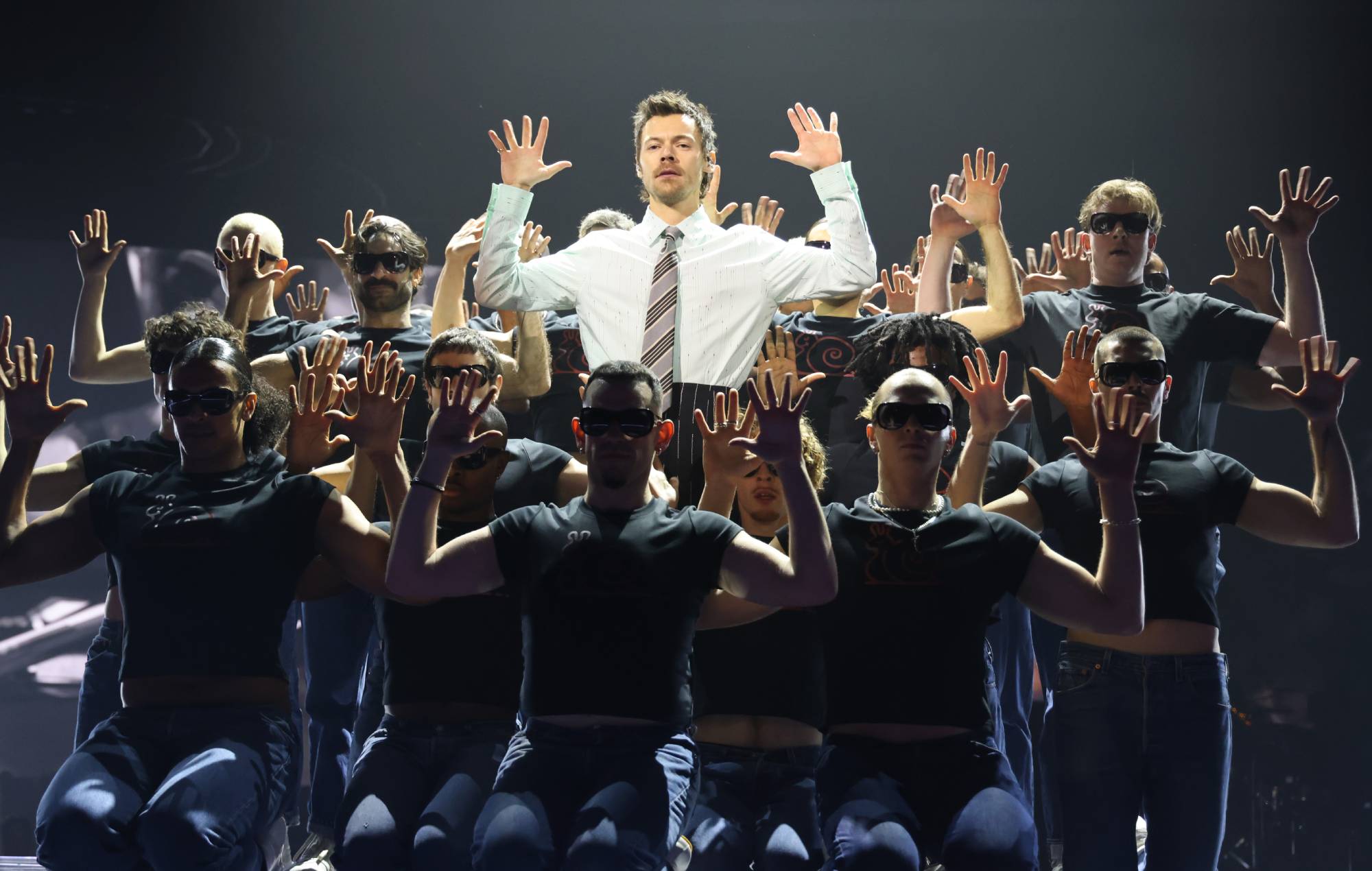 The flamboyantly choreographed performance saw him joined by dozens of dancers on stage.